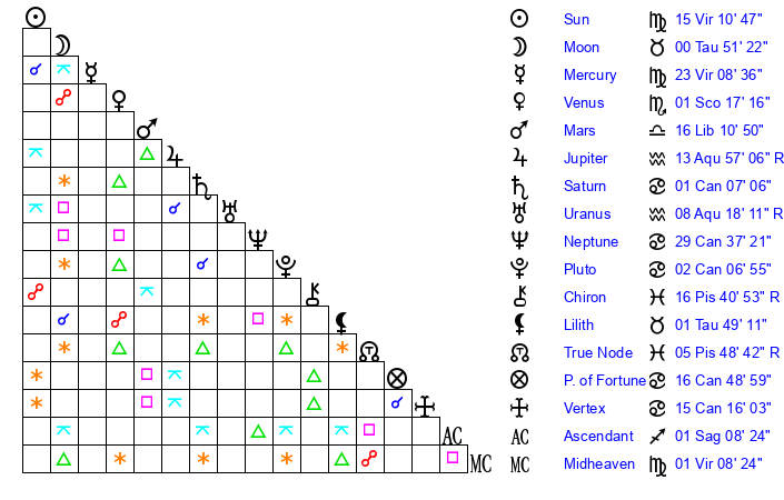 | Moon | 0 Taurus 52 | 28 Pisces 56 | 23 Taurus 33 |