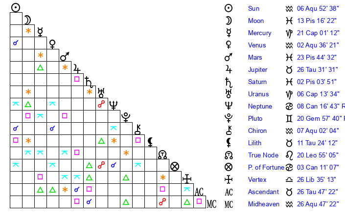 | Moon | 13 Pisces 14 | 14 Capricorn 55 | 11 Cancer 38 |