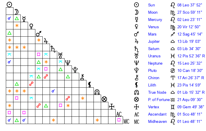 | Moon | 28 Scorpio 1 | 11 Scorpio 41 | 24 Leo 23 |