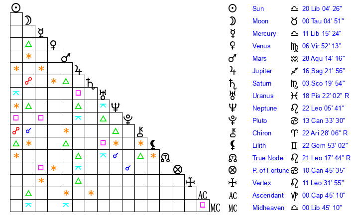 | Saturn | 3 Scorpio 51 | 26 Pisces 44 | 14 Scorpio 3 |