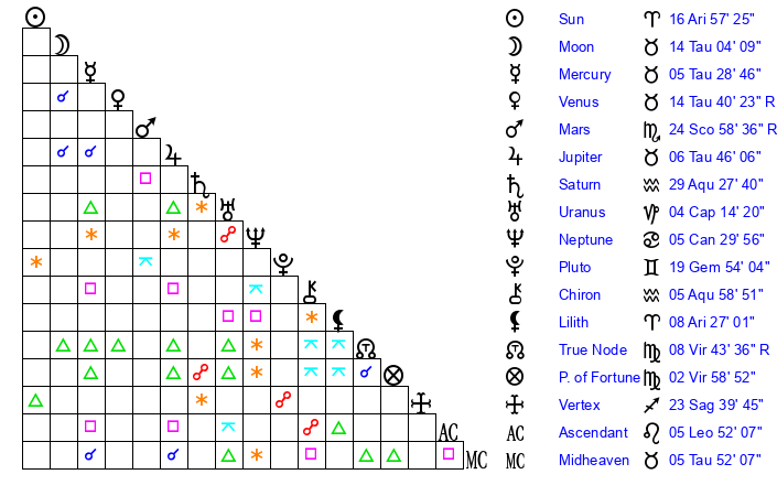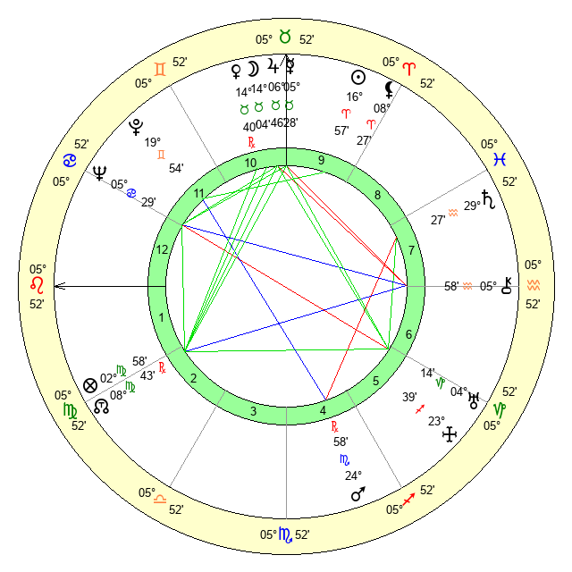 | Moon | 14 Taurus 6 | 16 Leo 13 | 9 Libra 23 |