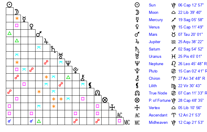 | Sun | 6 Capricorn 13 | 7 Capricorn 27 | 14 Aries 55 |