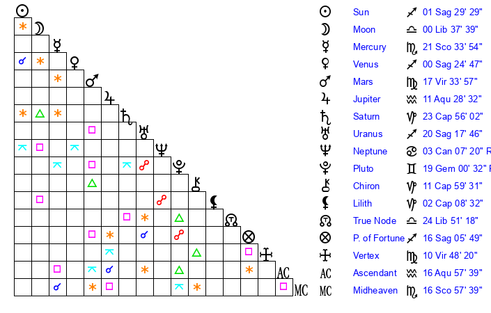 | Moon | 0 Libra 34 | 21 Capricorn 15 | 19 Pisces 43 |