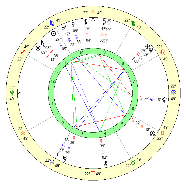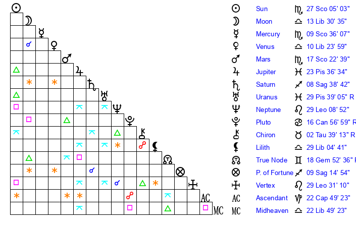 | Moon | 13 Libra 32 | 29 Scorpio 48 | 13 Taurus 55 |