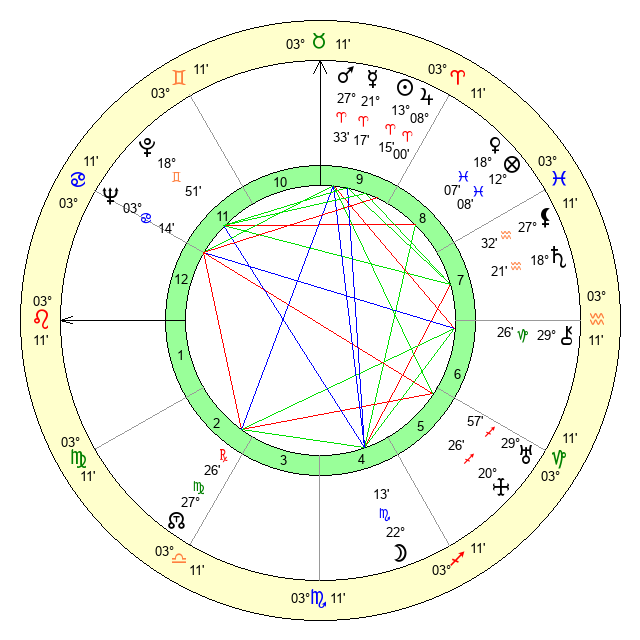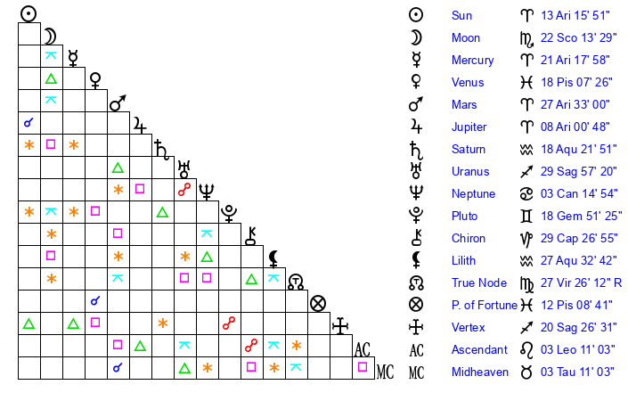| Sun | 13 Aries 16 | 13 Aries 56 | 9 Leo 41 |