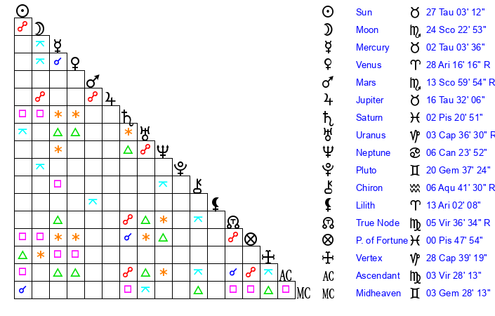 | Sun | 27 Taurus 3 | 28 Taurus 0 | 22 Virgo 10 |