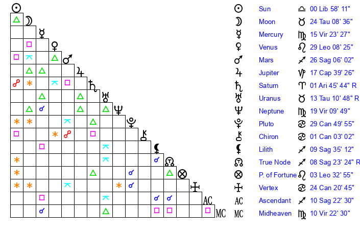 | Sun | 0 Libra 58 | 1 Libra 39 | 29 Sagittarius 10 |