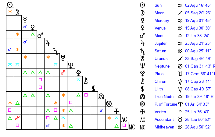 | Saturn | 0 Aquarius 51 | 16 Pisces 27 | 9 Aquarius 47 |