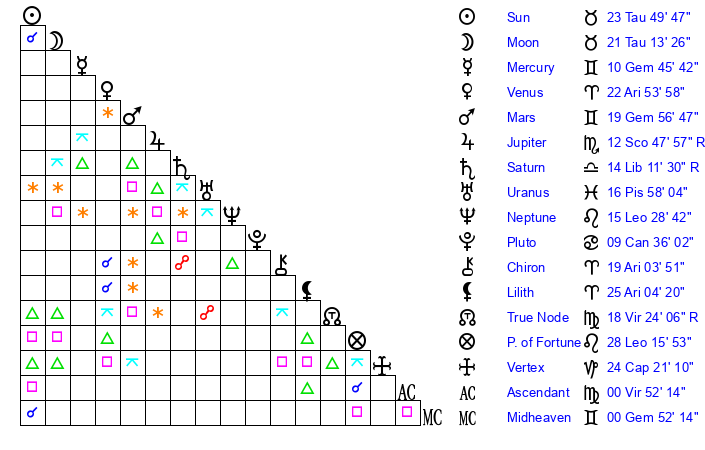 | Moon | 21 Taurus 15 | 28 Sagittarius 30 | 22 Aquarius 42 |