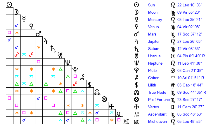 | Sun | 22 Leo 17 | 22 Leo 52 | 5 Sagittarius 56 |