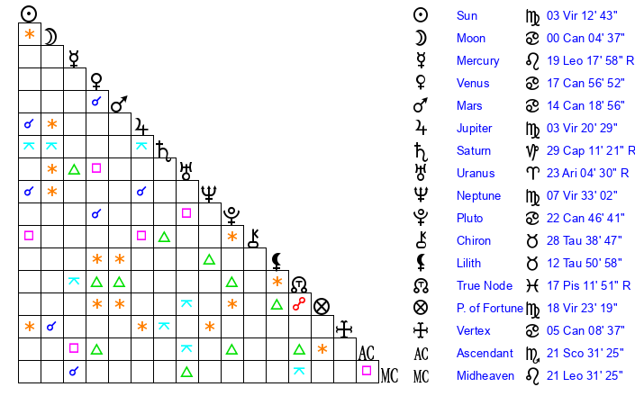 | Venus | 17 Cancer 57 | 1 Leo 13 | 0 Scorpio 52 |
