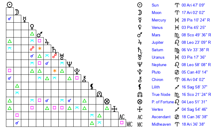 | Moon | 17 Aries 2 | 22 Sagittarius 20 | 19 Aquarius 28 |