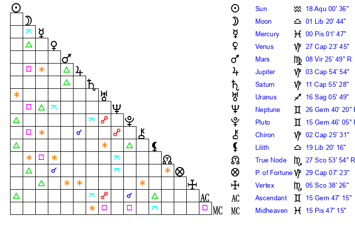 | Pluto | 15 Gemini 46 | 2 Aquarius 15 | 17 Gemini 14 |