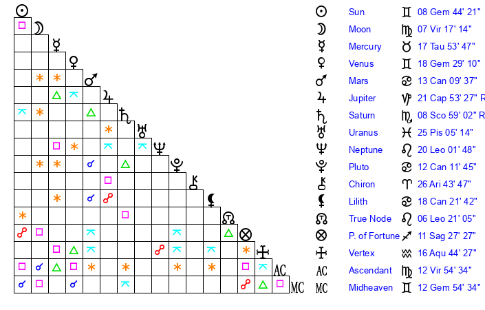 | Sun | 8 Gemini 44 | 9 Gemini 32 | 14 Virgo 32 |