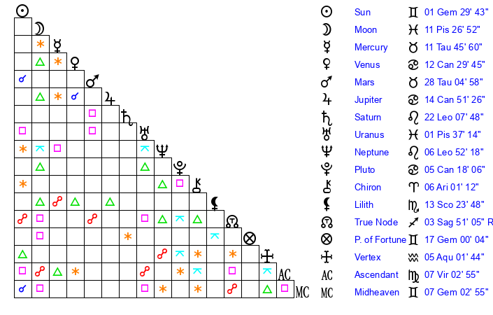 | Moon | 11 Pisces 19 | 14 Aries 51 | 29 Capricorn 29 |