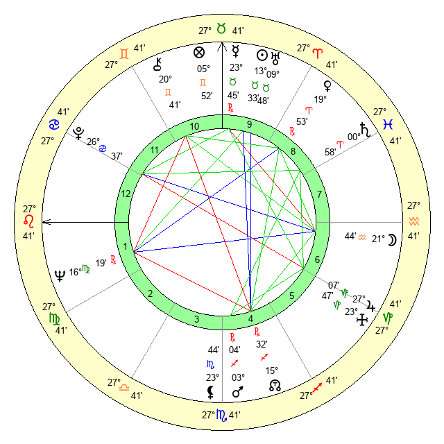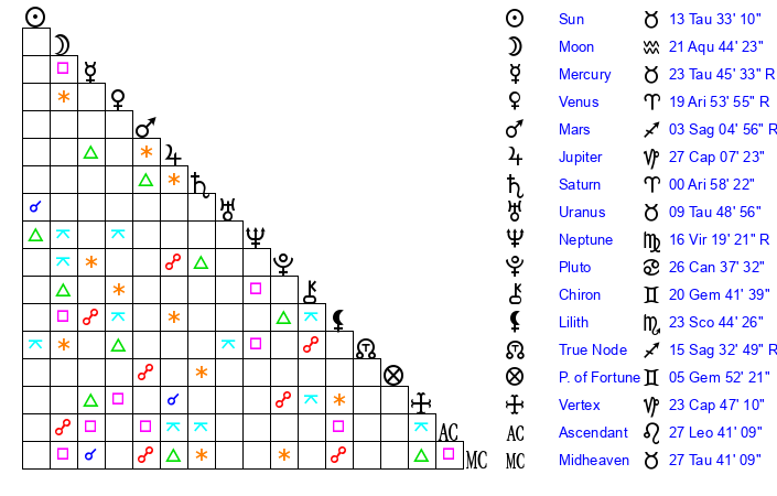 | Moon | 21 Aquarius 32 | 12 Leo 56 | 16 Taurus 34 |