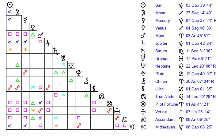 | Neptune | 22 Leo 19 | 27 Pisces 13 | 19 Leo 58 |