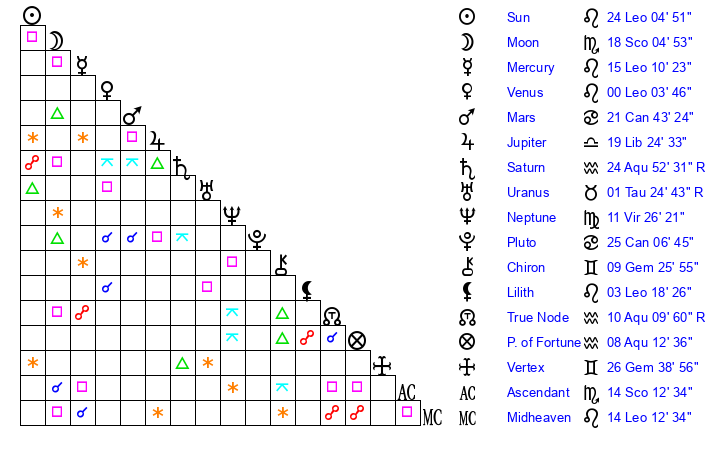| Moon | 18 Scorpio 1 | 14 Gemini 37 | 27 Pisces 26 |