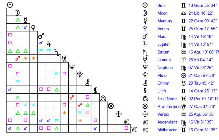 | Sun | 13 Gemini 36 | 14 Gemini 19 | 11 Virgo 41 |