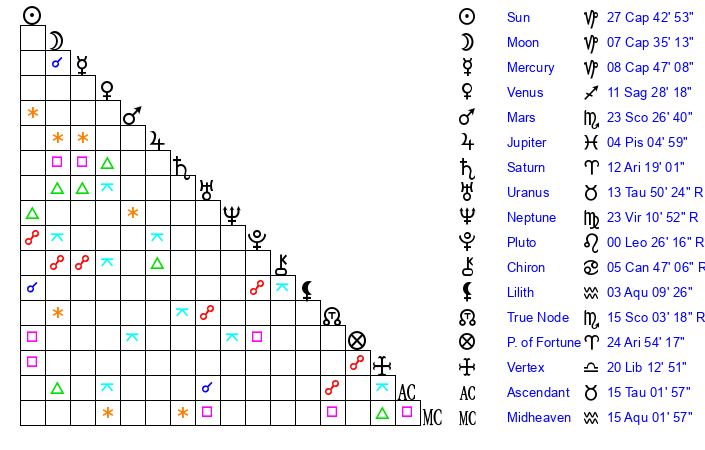 | Moon | 7 Capricorn 29 | 24 Virgo 40 | 26 Aquarius 50 |