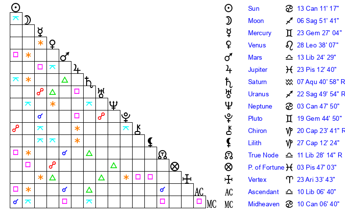 | Neptune | 3 Cancer 49 | 2 Aries 10 | 5 Cancer 46 |