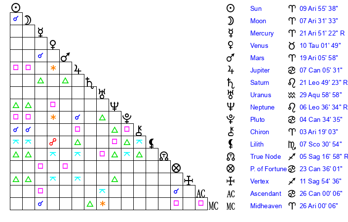 | Sun | 9 Aries 55 | 11 Aries 14 | 22 Cancer 8 |
