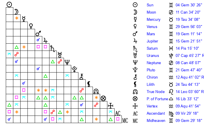 | Pluto | 21 Gemini 48 | 3 Aquarius 42 | 23 Gemini 47 |