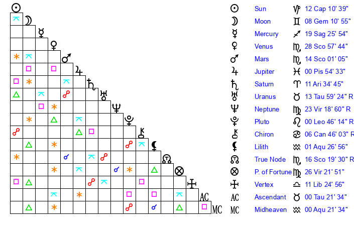 | Sun | 12 Capricorn 10 | 13 Capricorn 19 | 8 Aries 51 |