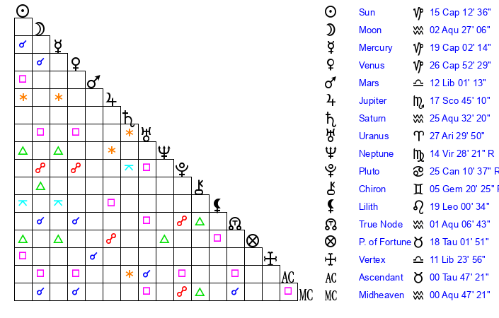 | Saturn | 25 Aquarius 41 | 14 Pisces 53 | 6 Pisces 1 |