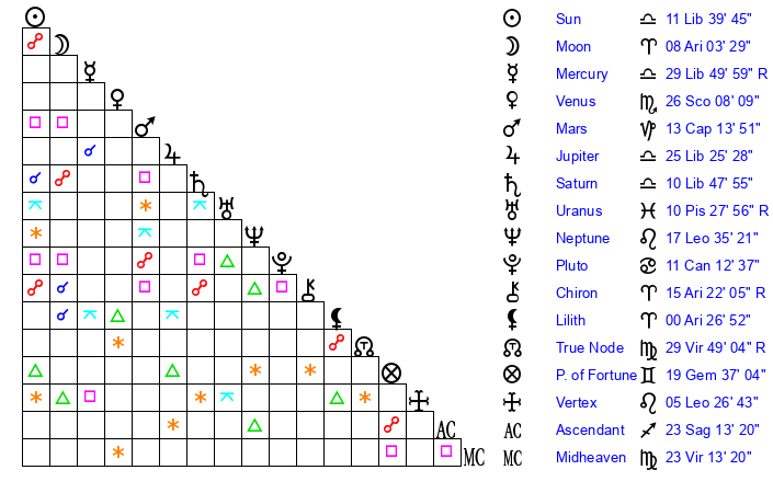 | Mercury | 29 Libra 49 | 28 Libra 30 | 13 Aquarius 52 |