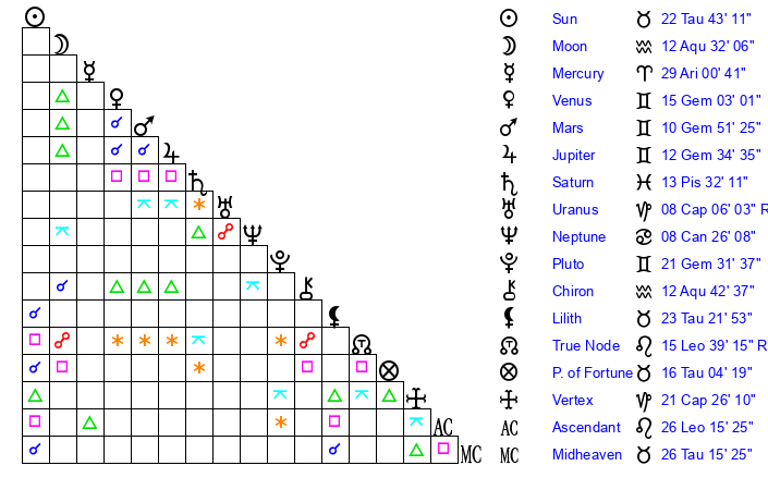 | Pluto | 21 Gemini 32 | 3 Aquarius 47 | 23 Gemini 44 |