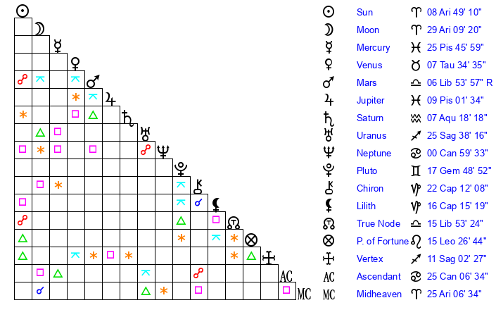 | Sun | 8 Aries 49 | 10 Aries 14 | 6 Leo 20 |