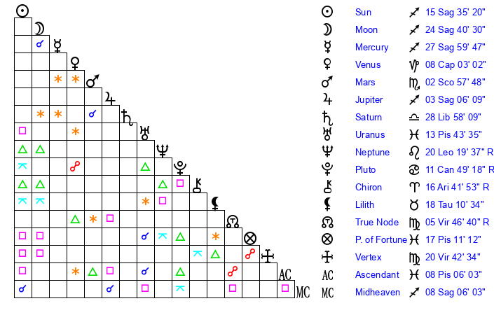 | Sun | 15 Sagittarius 35 | 16 Sagittarius 51 | 28 Pisces 49 |