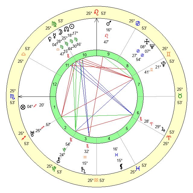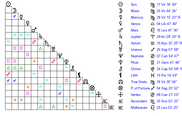 | Moon | 25 Virgo 40 | 24 Aries 19 | 1 Pisces 1 |