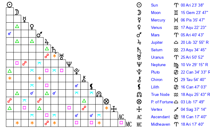 | Sun | 0 Aries 23 | 1 Aries 20 | 28 Gemini 39 |