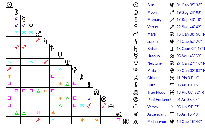 | Moon | 19 Sagittarius 25 | 18 Pisces 21 | 28 Capricorn 10 |