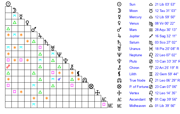 | Sun | 21 Libra 4 | 21 Libra 36 | 3 Aquarius 12 |