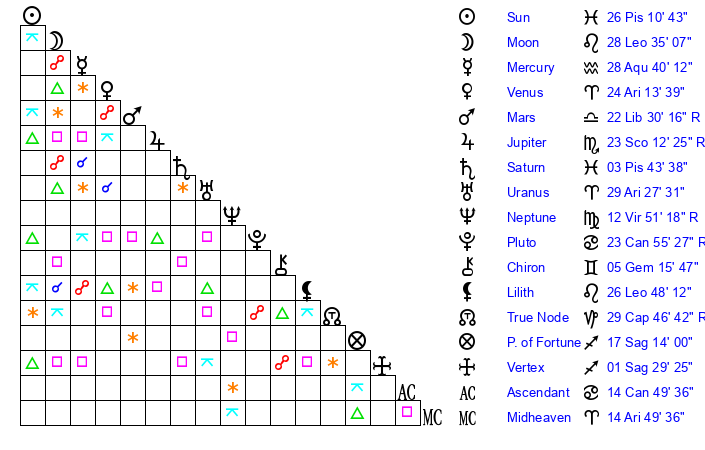 | Sun | 26 Pisces 10 | 27 Pisces 21 | 23 Gemini 39 |
