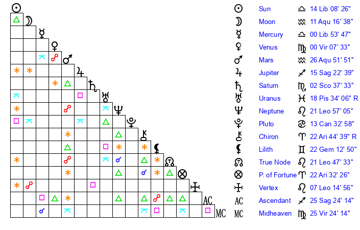 | Sun | 14 Libra 9 | 14 Libra 41 | 26 Capricorn 5 |