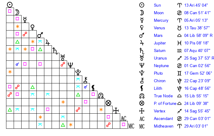 | Sun | 13 Aries 45 | 15 Aries 10 | 11 Leo 7 |