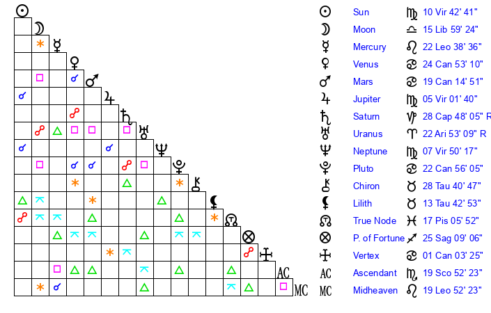 | Neptune | 7 Virgo 50 | 1 Aries 17 | 10 Virgo 10 |
