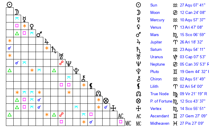 | Sun | 27 Aquarius 8 | 28 Aquarius 1 | 24 Gemini 36 |
