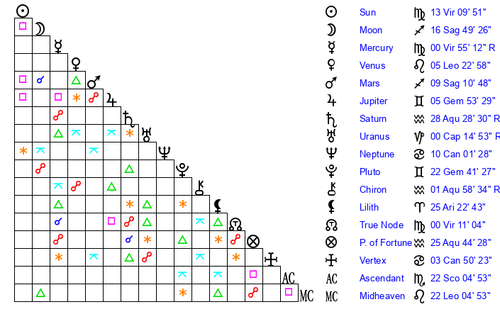 | Sun | 13 Virgo 10 | 14 Virgo 7 | 13 Capricorn 12 |