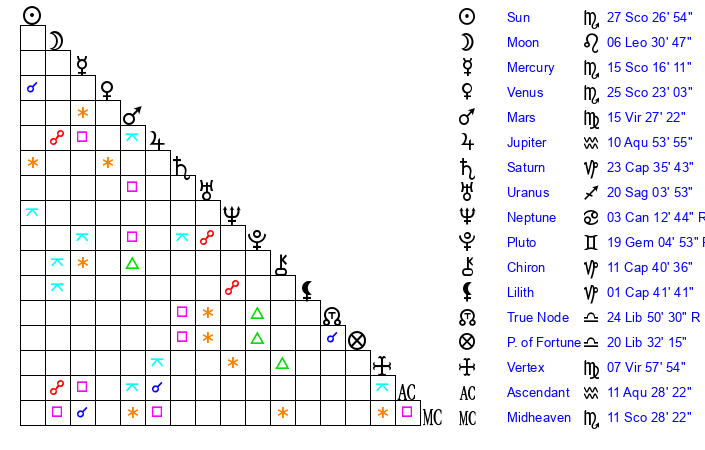 | Mercury | 15 Scorpio 16 | 27 Scorpio 52 | 13 Pisces 41 |