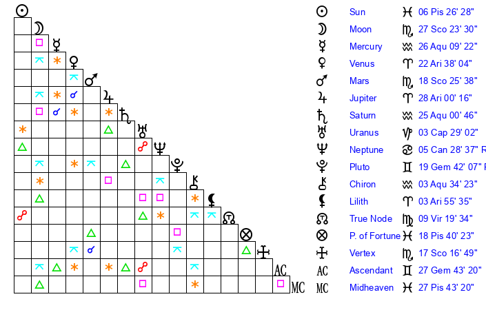 | Moon | 27 Scorpio 21 | 6 Aquarius 26 | 12 Aries 59 |