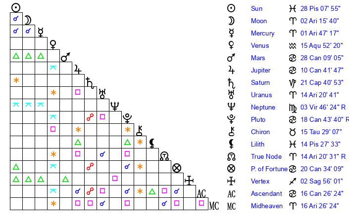 | Moon | 2 Aries 16 | 28 Scorpio 12 | 12 Virgo 7 |