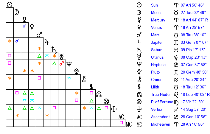 | Sun | 7 Aries 51 | 9 Aries 0 | 2 Leo 32 |