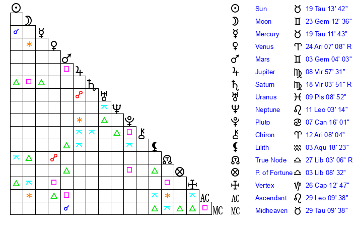 | Mercury | 19 Taurus 12 | 29 Aries 55 | 27 Leo 47 |