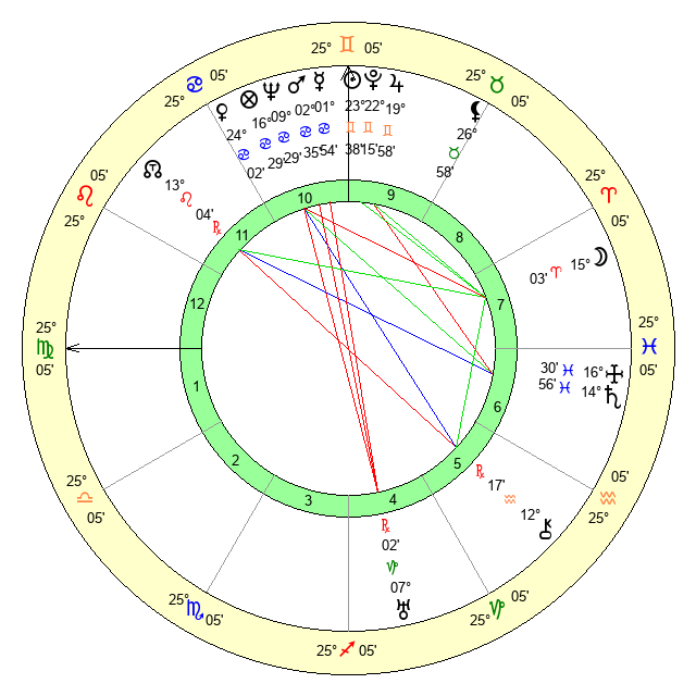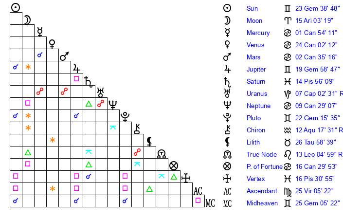 | Sun | 23 Gemini 39 | 24 Gemini 50 | 18 Libra 27 |