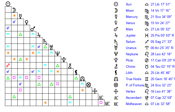 | Sun | 27 Libra 18 | 28 Libra 33 | 6 Aquarius 32 |